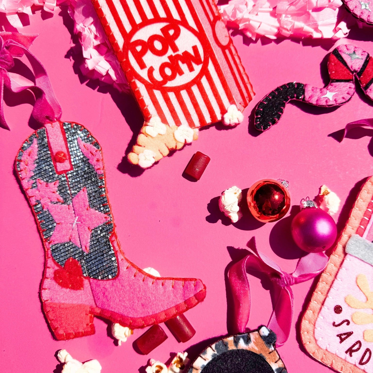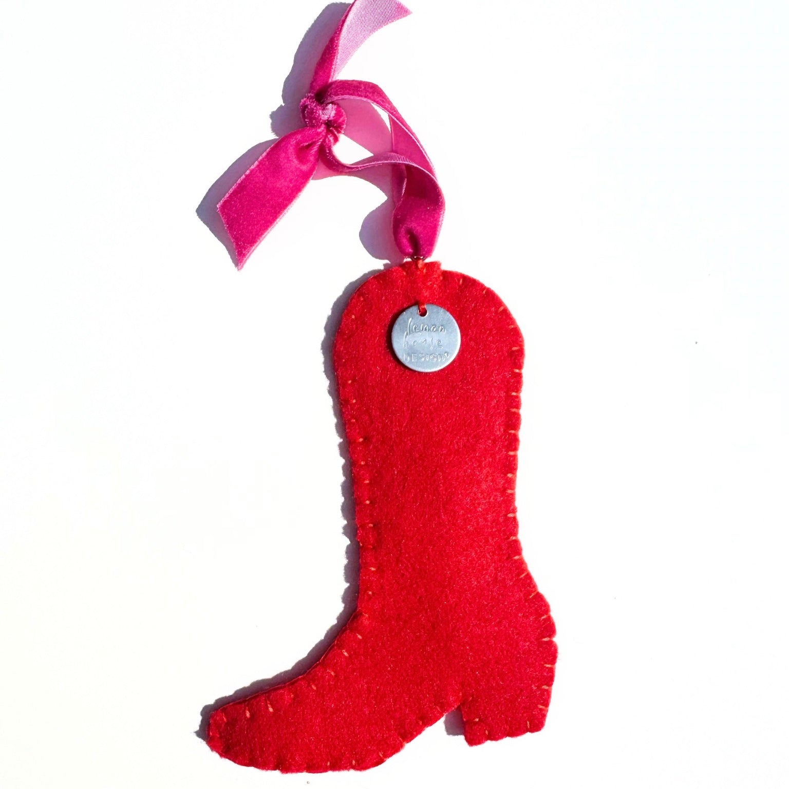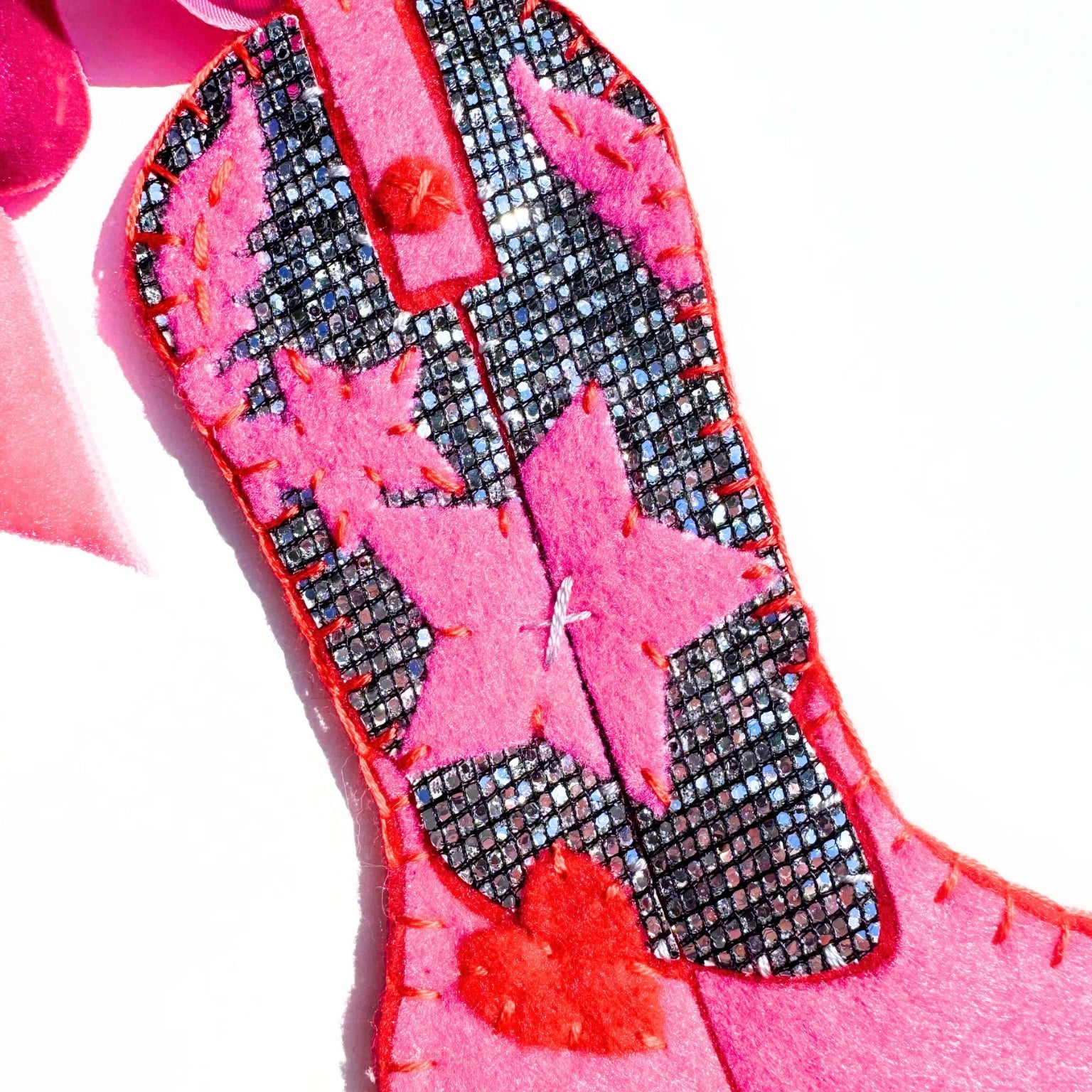 Yeehaw but make it sparkle! This handsewn felt cowgirl boot brings the party with silver glitter accents, star power and the tiniest heart that’ll steal yours. It’s got disco ball shimmer and a whole lot of charm—totally unique, totally fun, and ready to giddy-up on your tree.