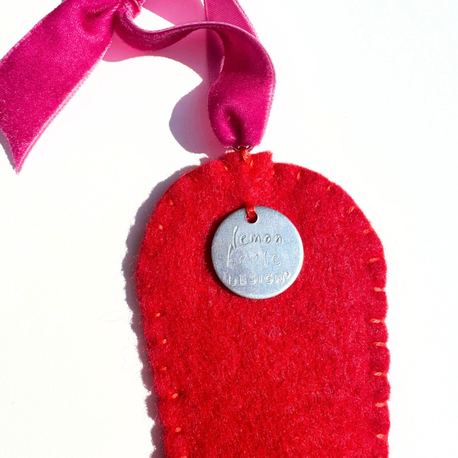- Hand stamped metal charm featuring the "Lemon House Design" logo sewn on the back.