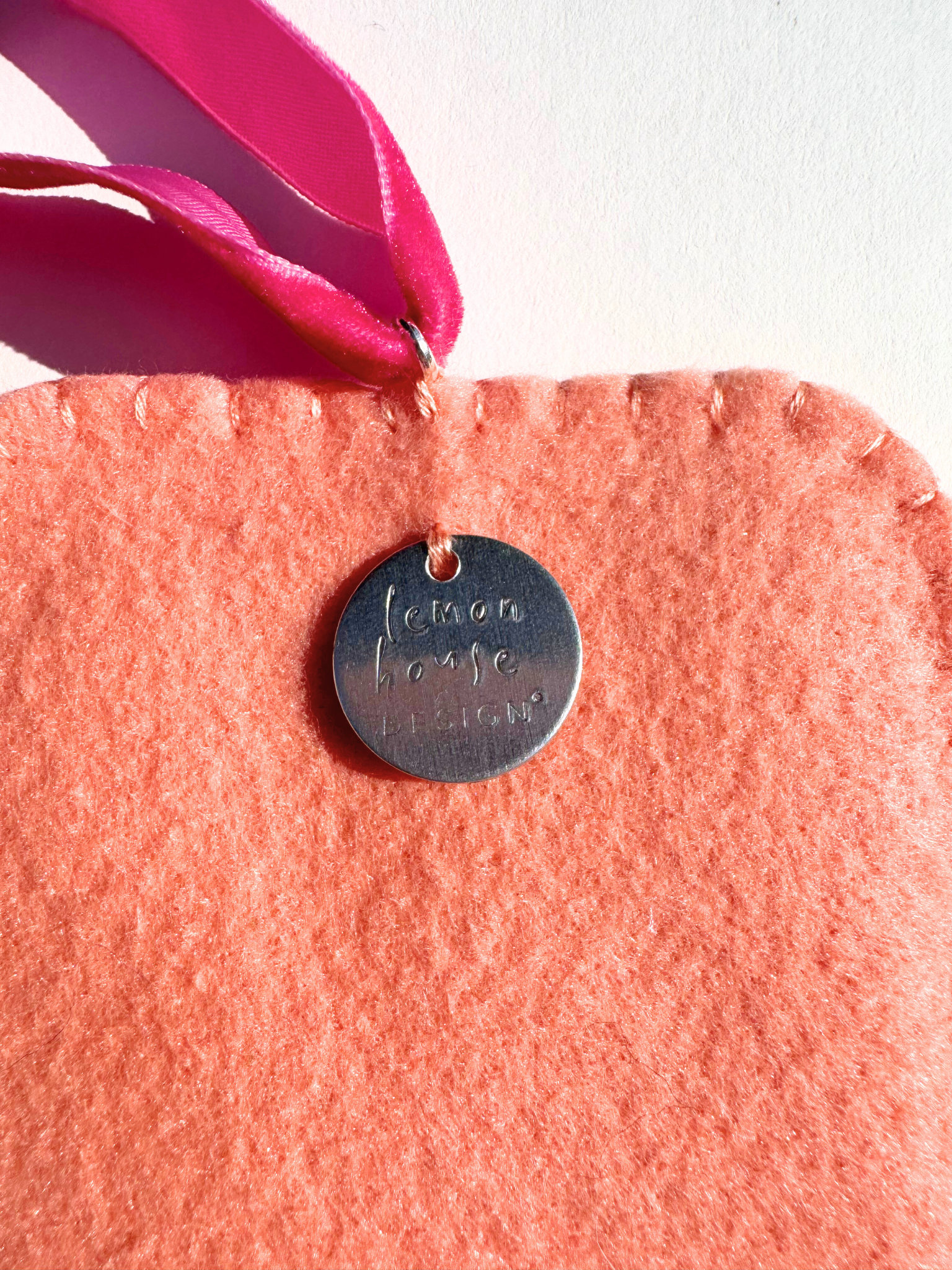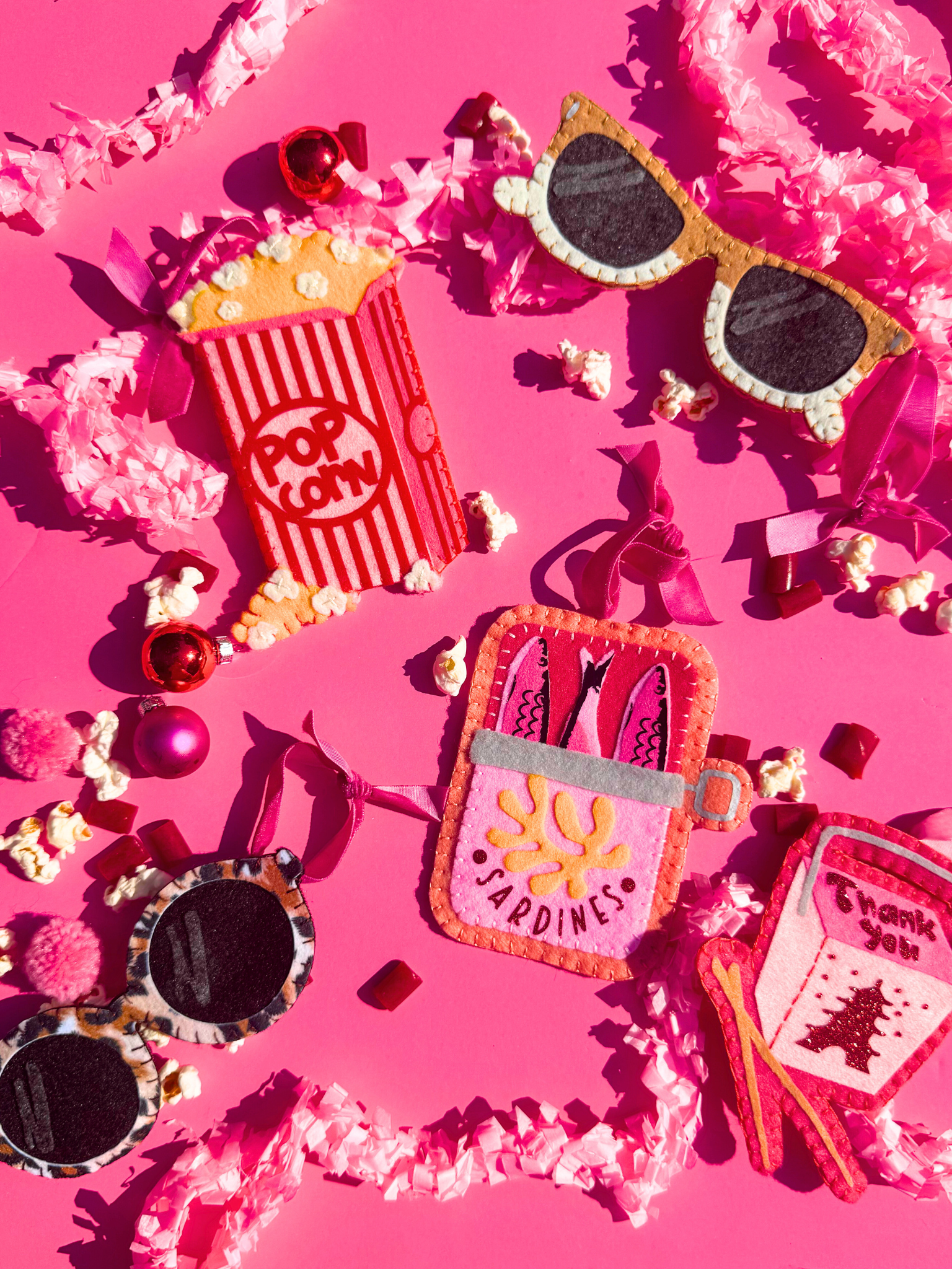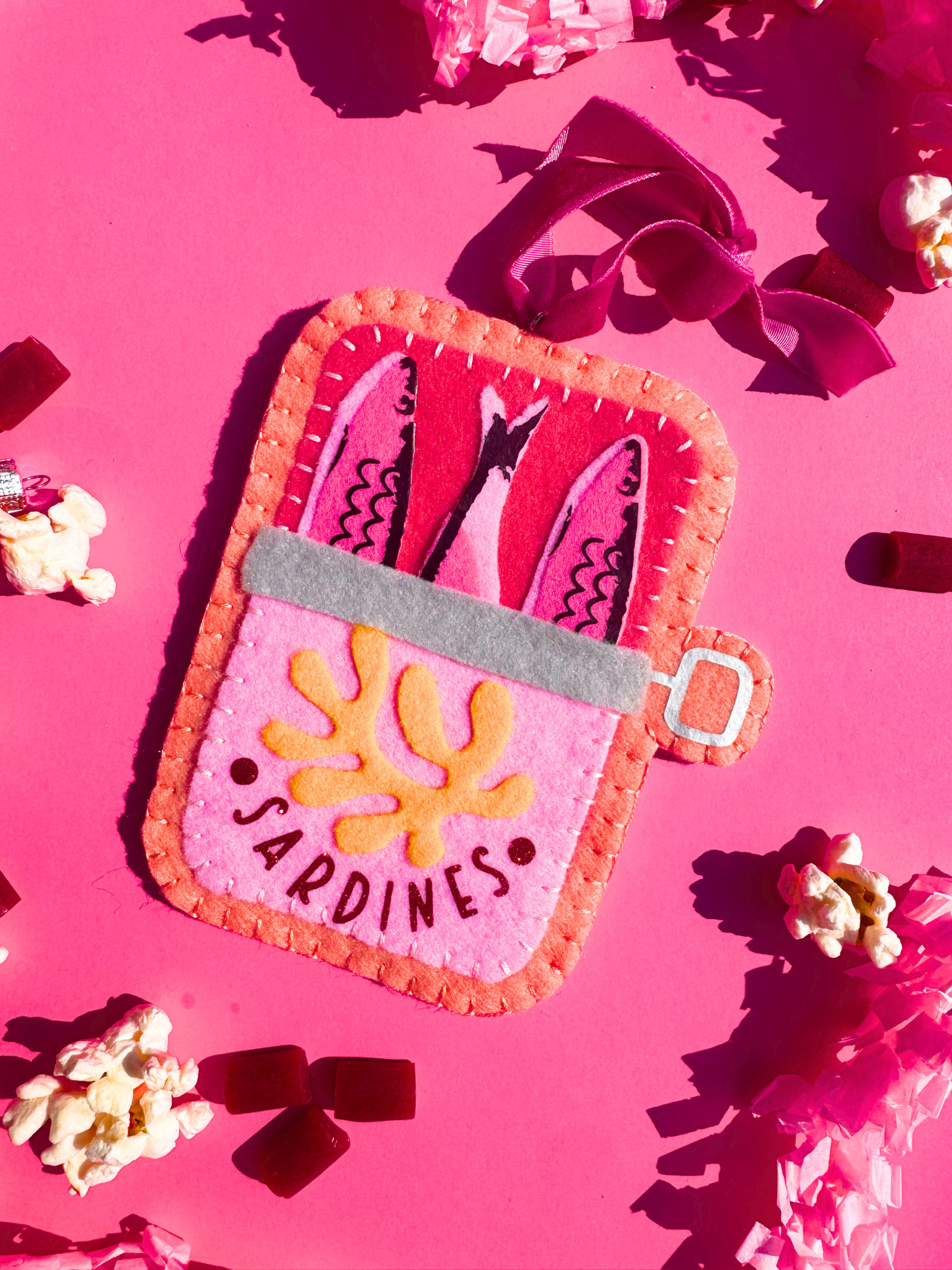 Sardines, but make it pink!  This handmade felt sardine can ornament features fun fish tucked into a glittery can in juicy shades of peach, pink, goldenrod, and red. Generously sized and super soft.  Finished with a hot pink velvet ribbon, it’s a maximalist wink to vintage kitsch and snack-time sass. Whimsical, weird, and totally wonderful.