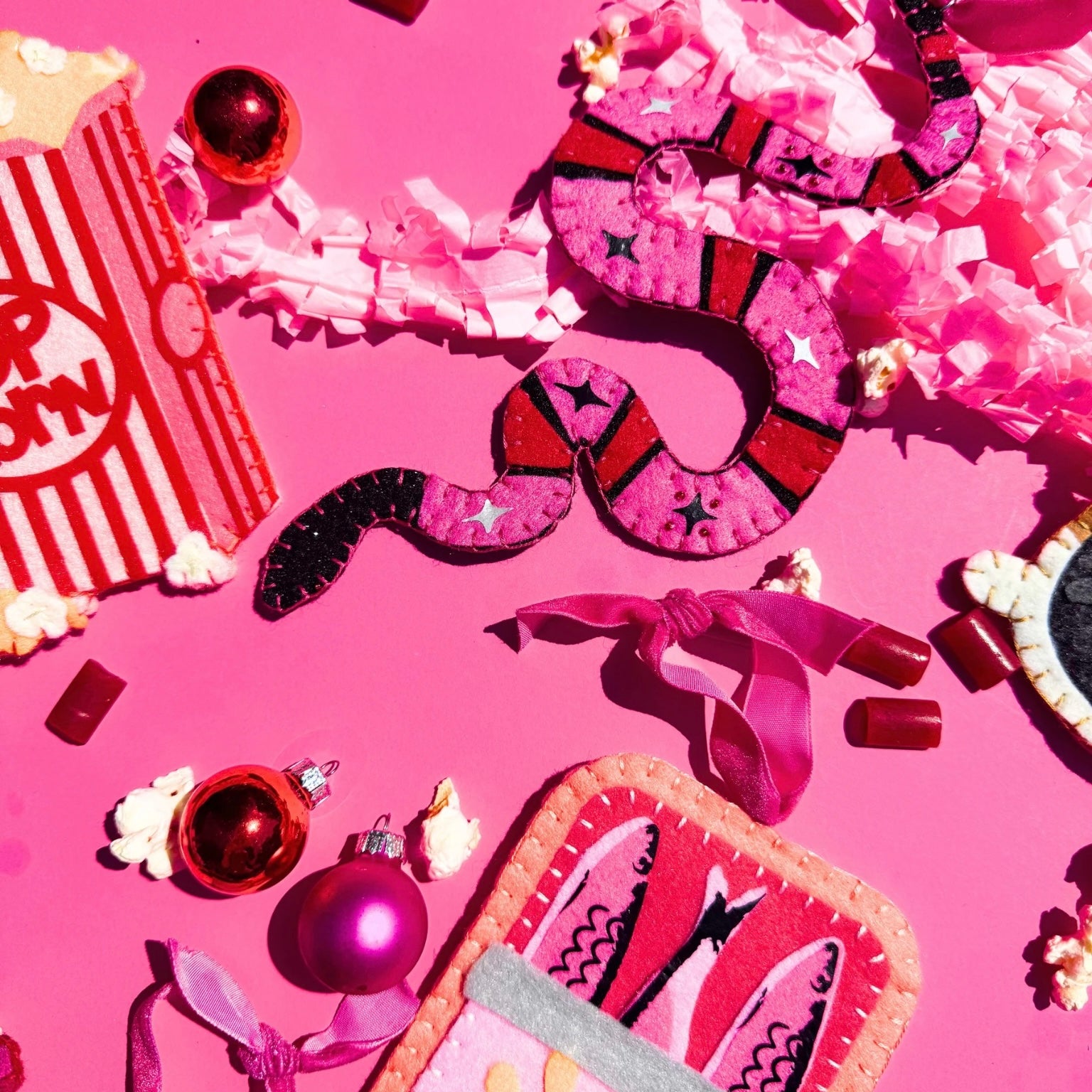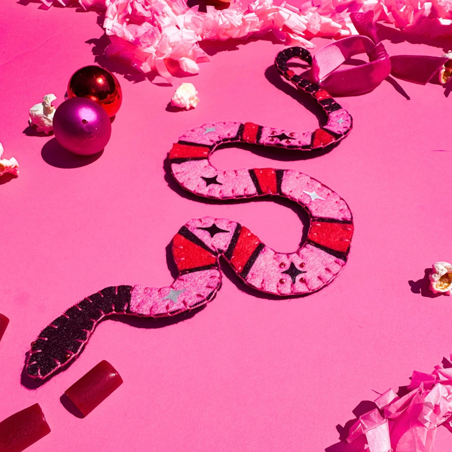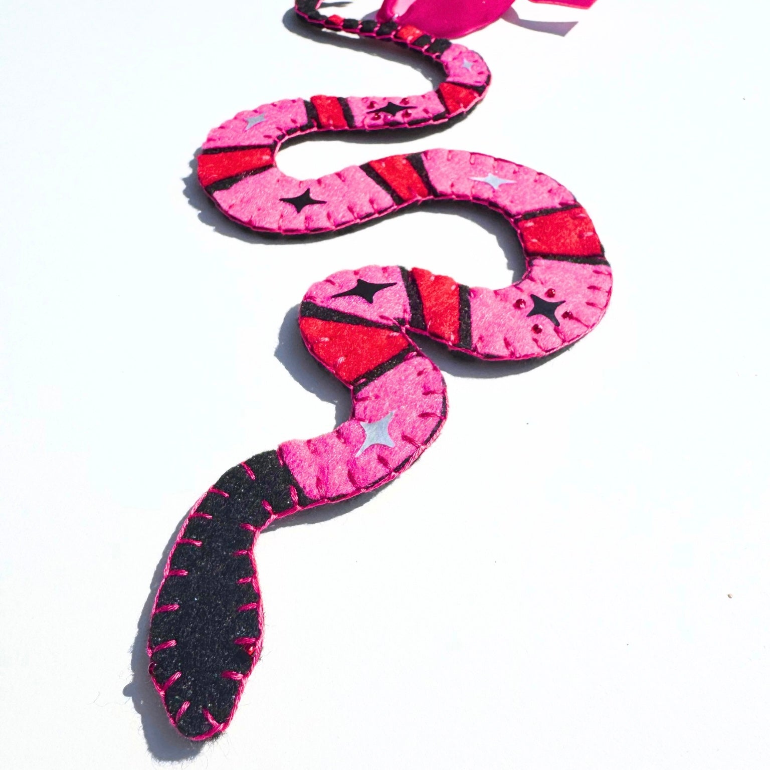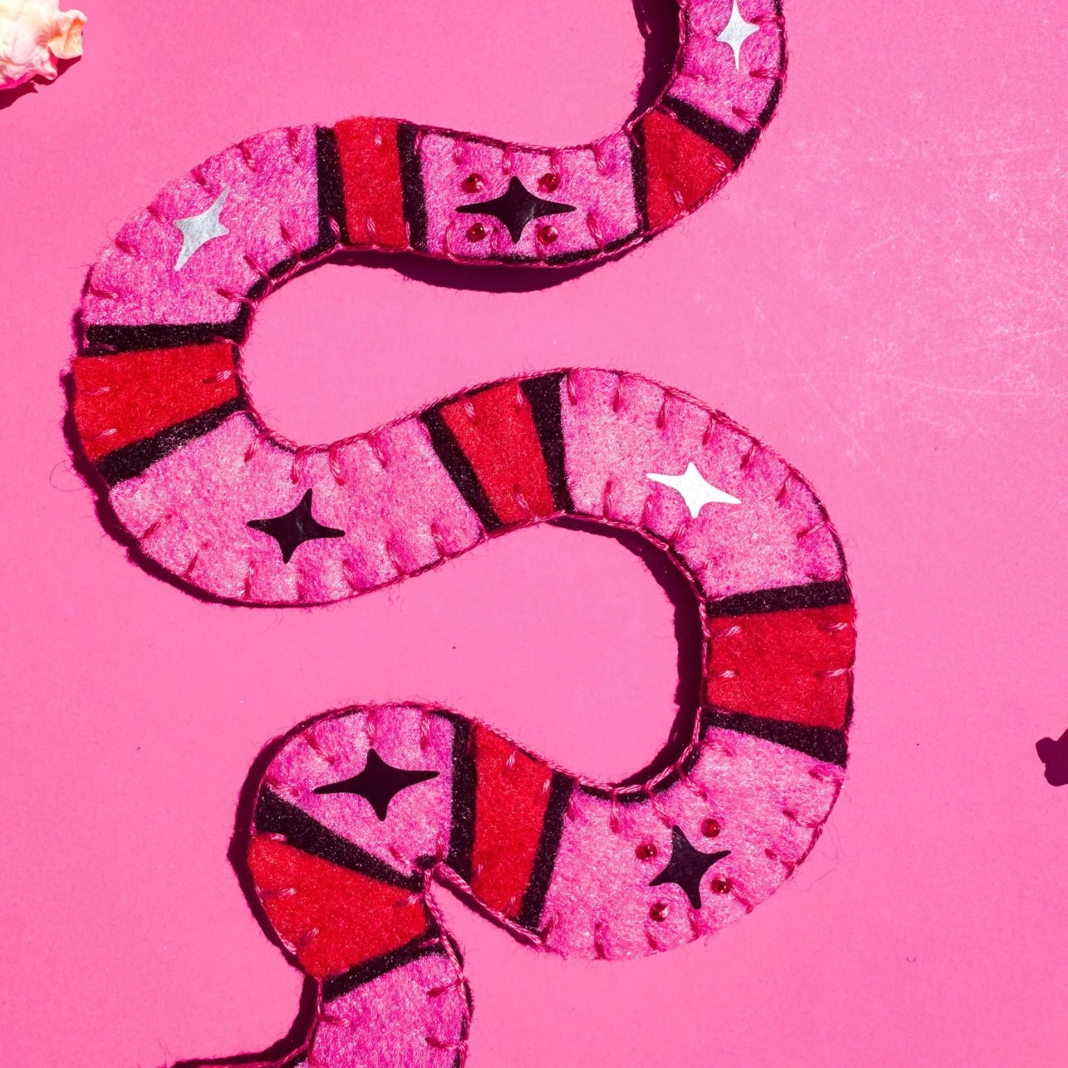 This snake’s not here to scare—it’s here to slay. Handsewn from felt in bold stripes of candy pink, red, and black, it’s decked out with star cutouts, silver sparkles, and just the right dose of glam. It’s a definite statement piece that brings the sass wherever it slithers.